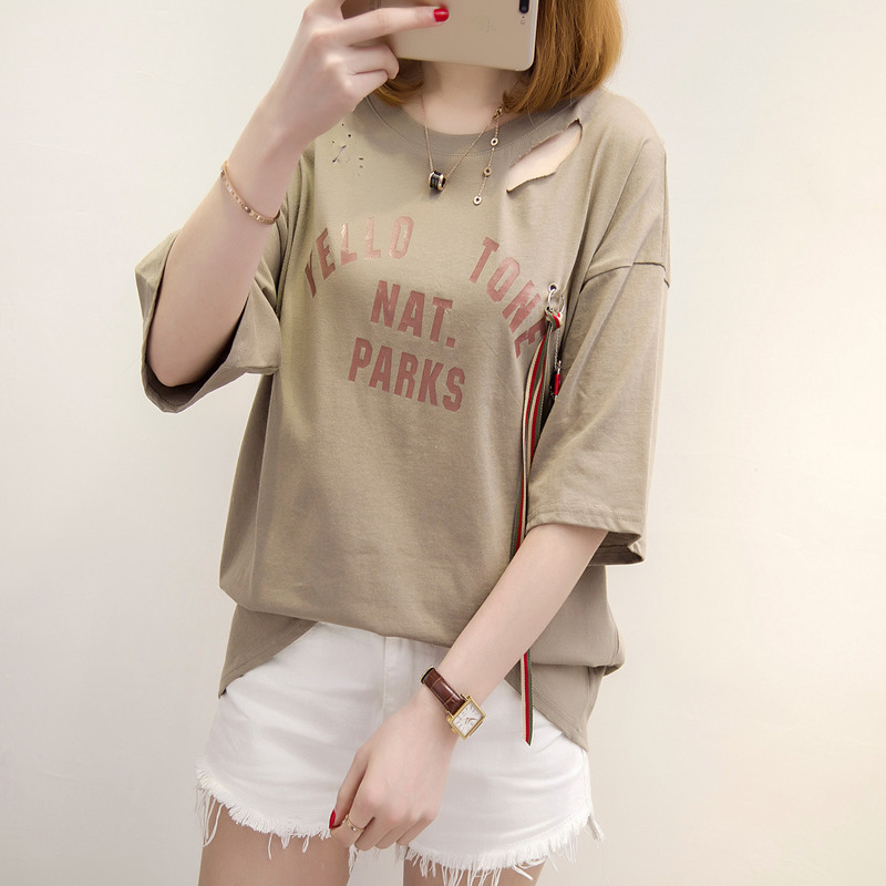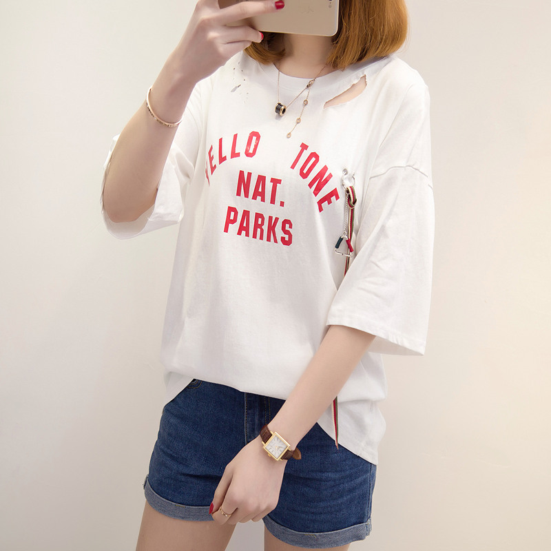 / 短袖上衣女夏新款破洞鏤空白色t恤女中長袖寬松韓版打底百搭