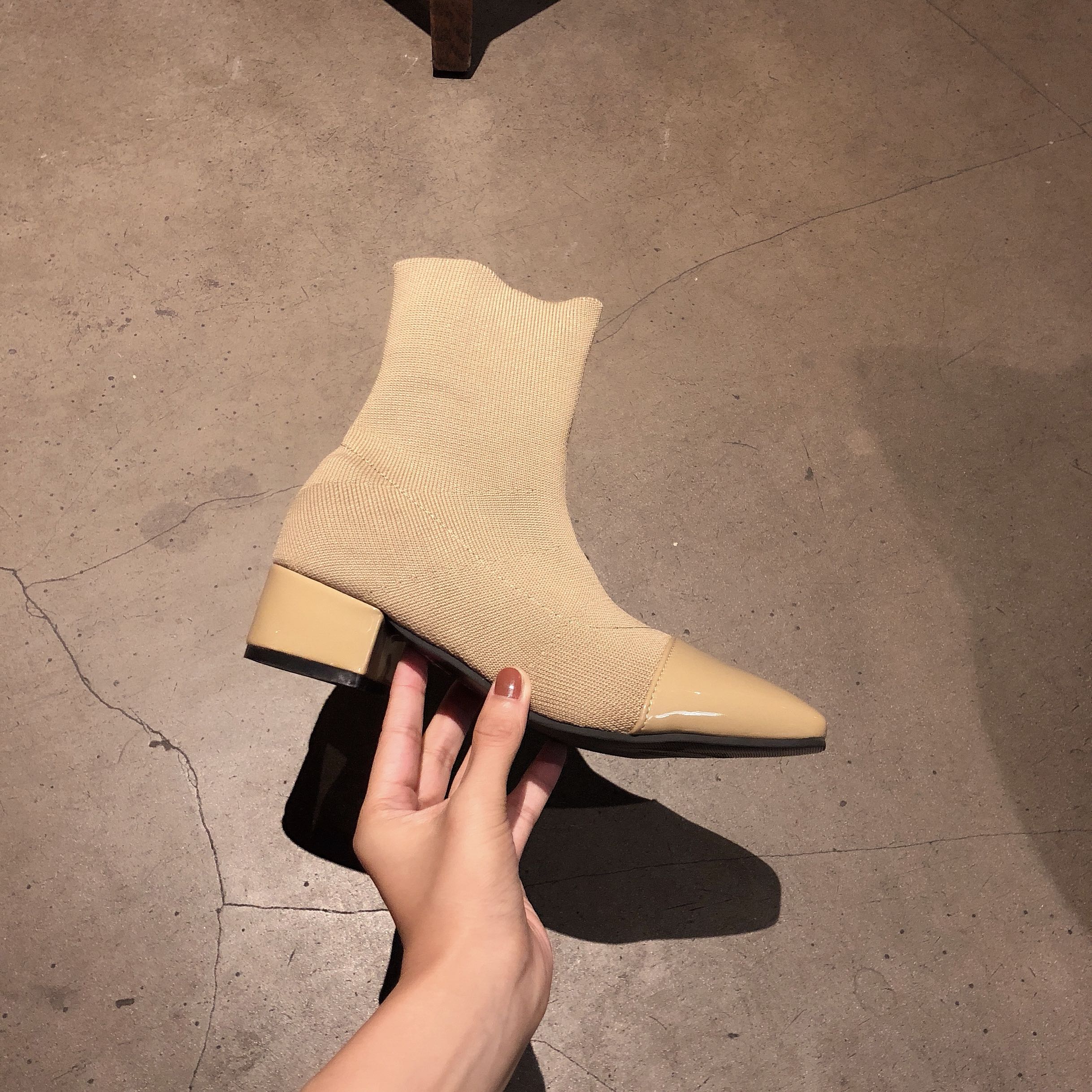 / 2018韓國新款chic百搭純色PU鞋套腳方頭中筒靴黑色高幫鞋女鞋柔軟