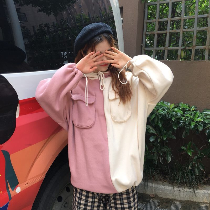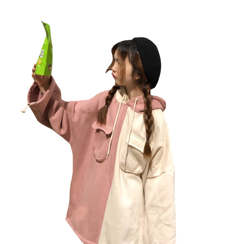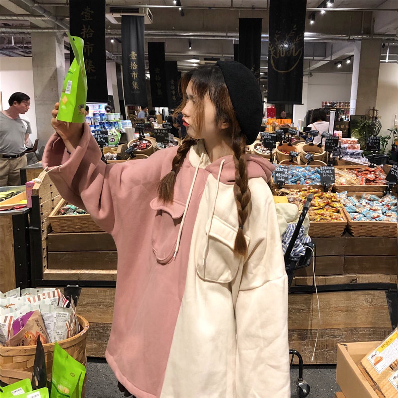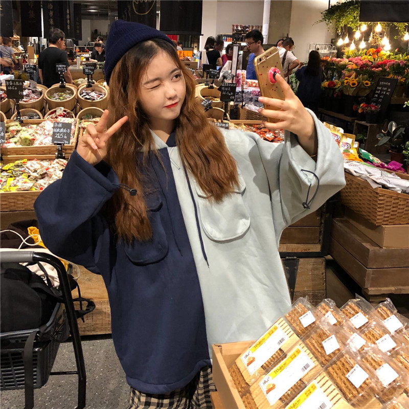 2018新款秋冬韓版撞色拼接連帽中長款加絨pp home超火衛衣外套女