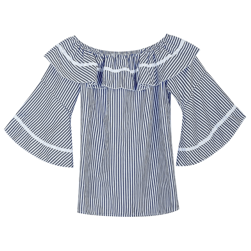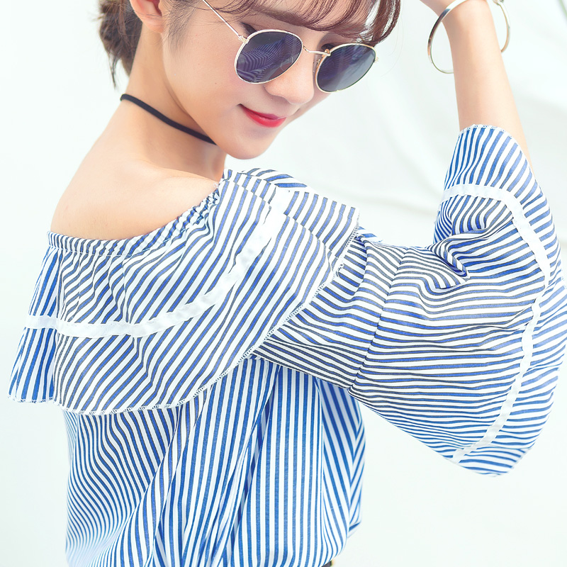 / 夏裝新款韓版女裝一字領漏肩襯衫喇叭袖荷葉邊條紋襯衣上衣潮