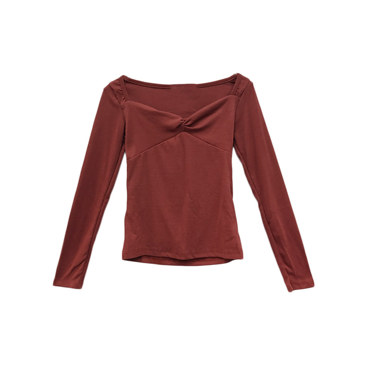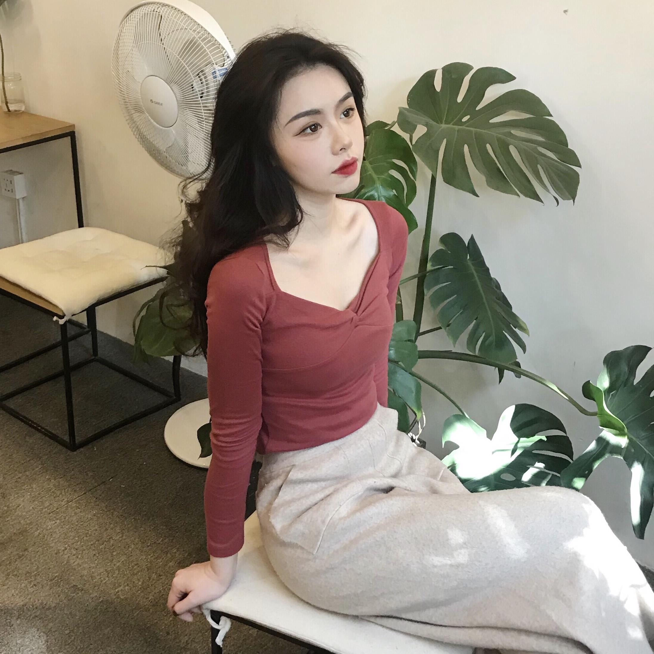 時尚復古韓風秋裝女2018新款V領方領打底衫胸前打結顯白上衣女T恤