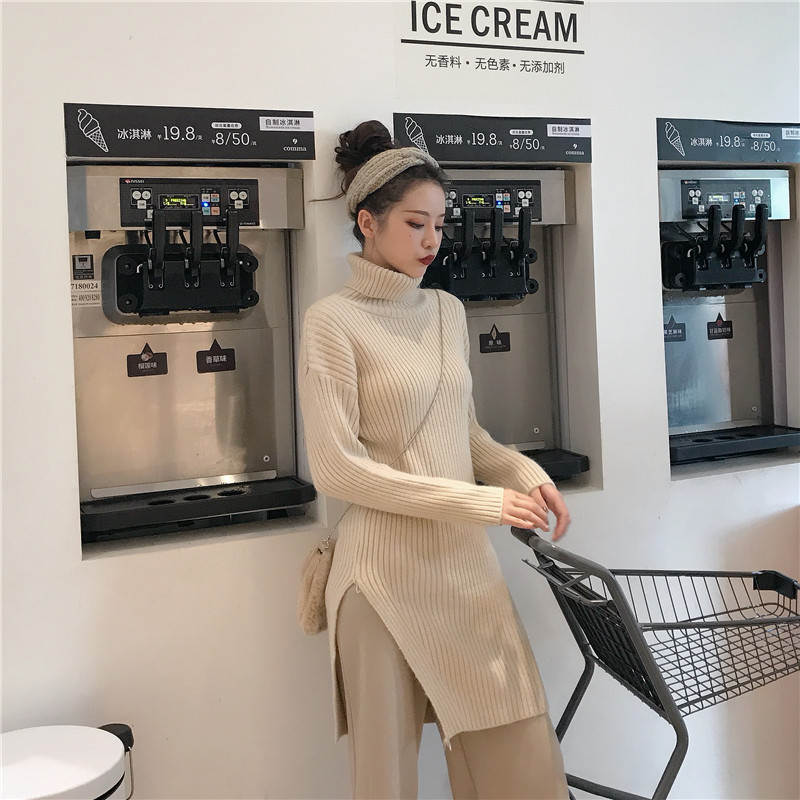 / 慵懶高領針織開叉毛衣時尚套裝純色休閑褲闊腿褲長褲chic兩件套女
