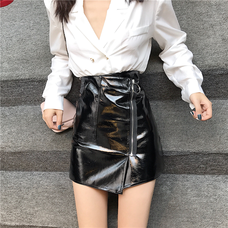 / 港味氣質百搭高腰半身裙女春秋新款不規則a字短皮裙拉鏈亮面裙子
