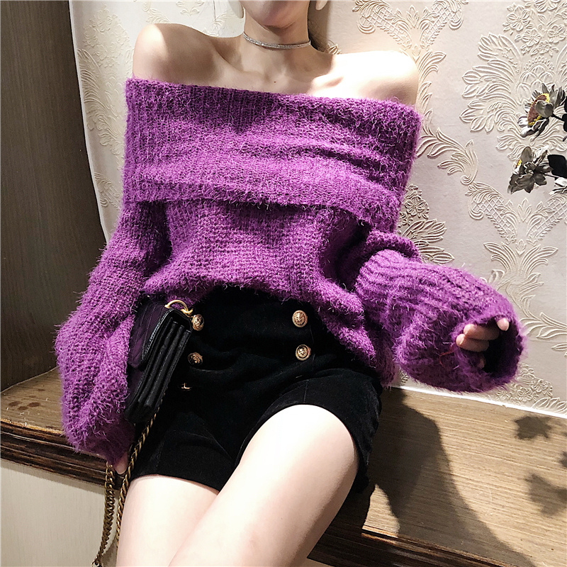 / 2018新款韓版毛衣女性感露肩一字肩大翻領針織衫加厚寬松打底上衣