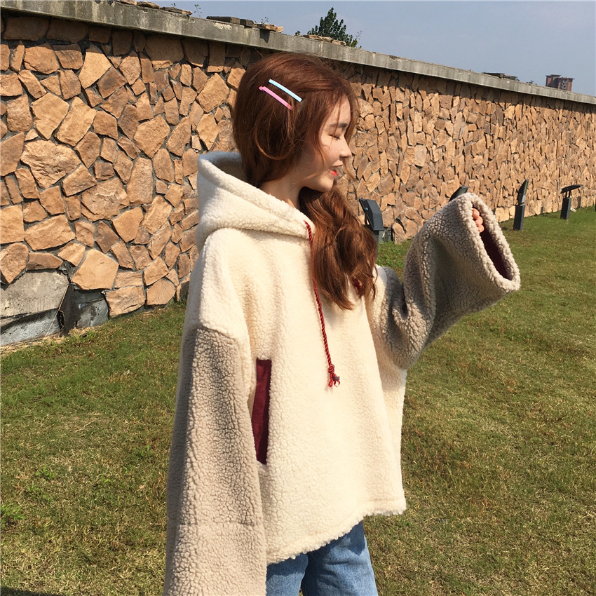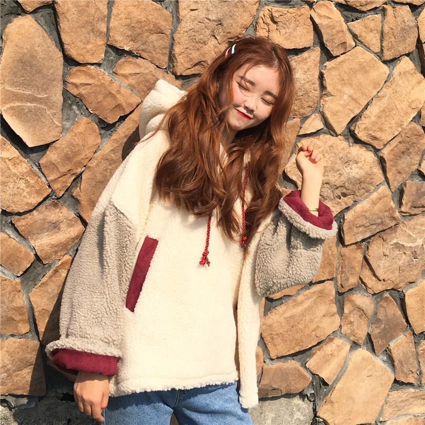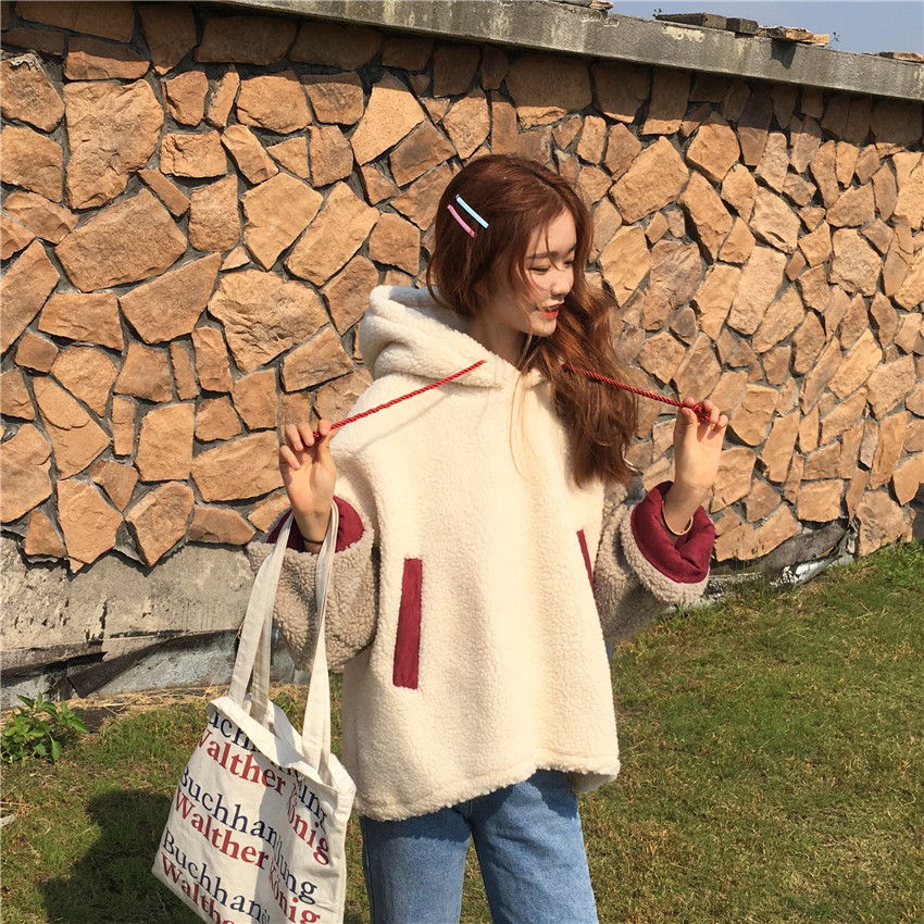 秋冬韓版寬松慵懶風撞色仿羊羔毛連帽加厚保暖套頭超火衛衣外套女