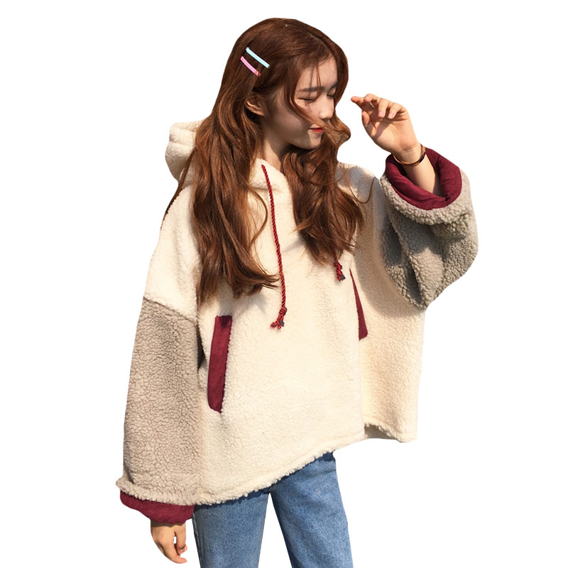 / 秋冬韓版寬松慵懶風撞色仿羊羔毛連帽加厚保暖套頭超火衛衣外套女