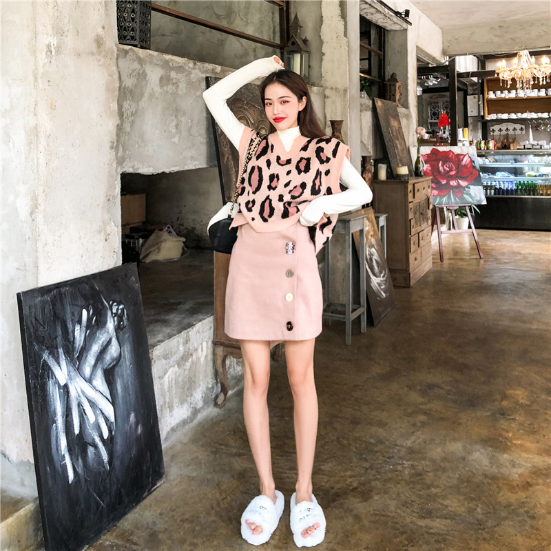 秋裝女2018新款套裝高領打底衫+V領開叉豹紋馬甲+個性紐扣半身裙