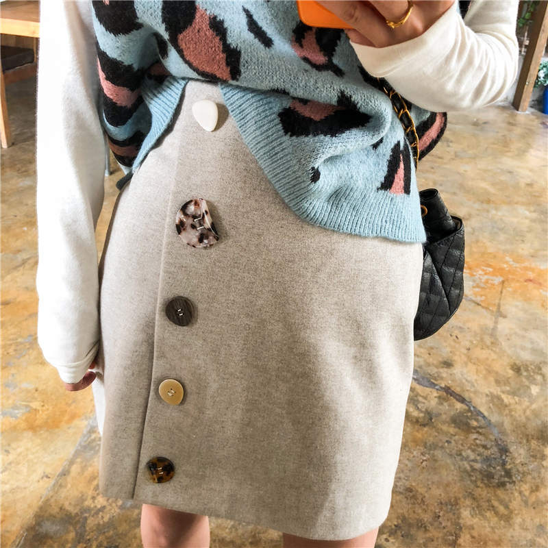 / 秋裝女2018新款套裝高領打底衫+V領開叉豹紋馬甲+個性紐扣半身裙