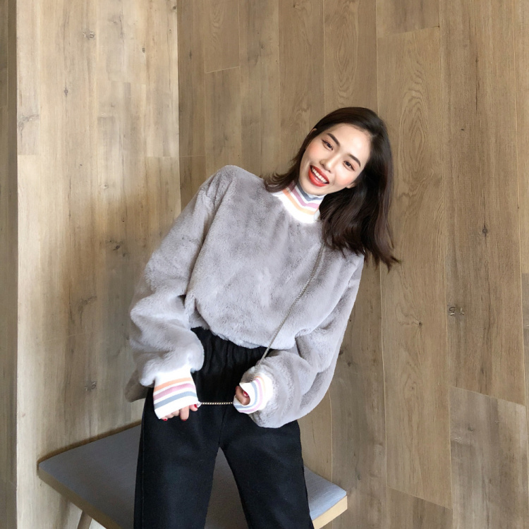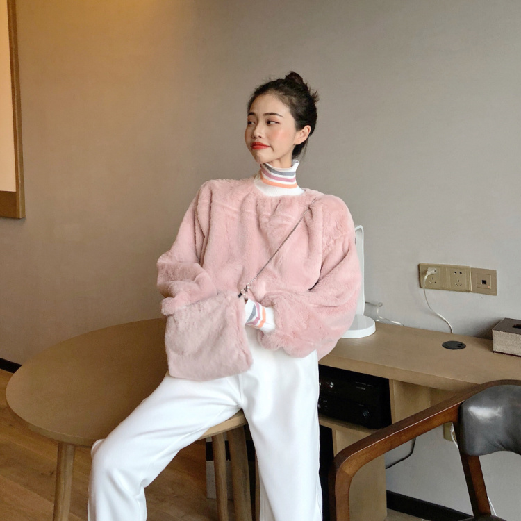 寬松毛絨加厚套頭衛衣女冬2018新款上衣外套+毛呢休閑褲呢子長褲