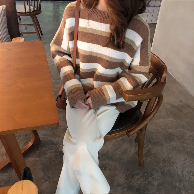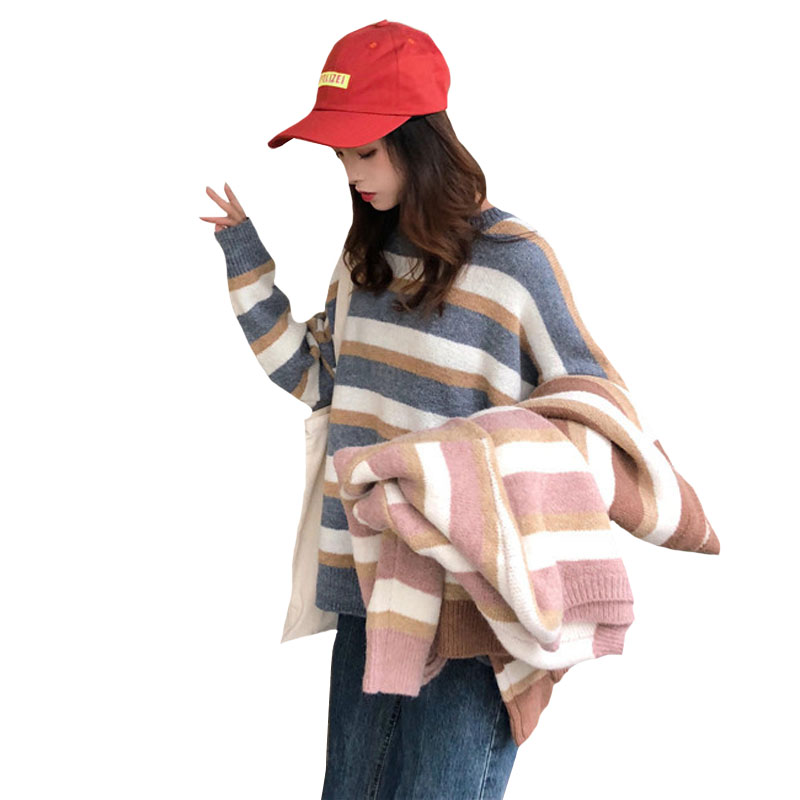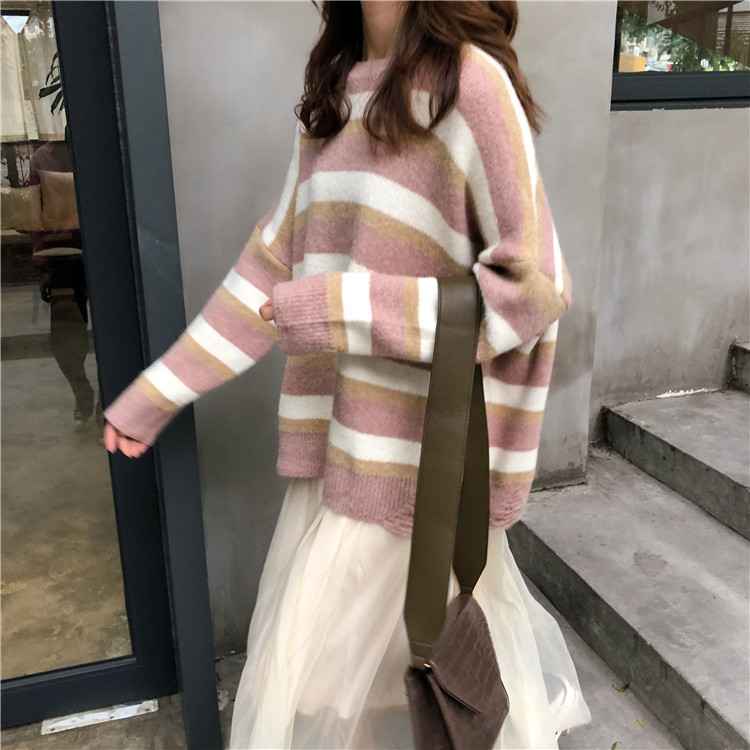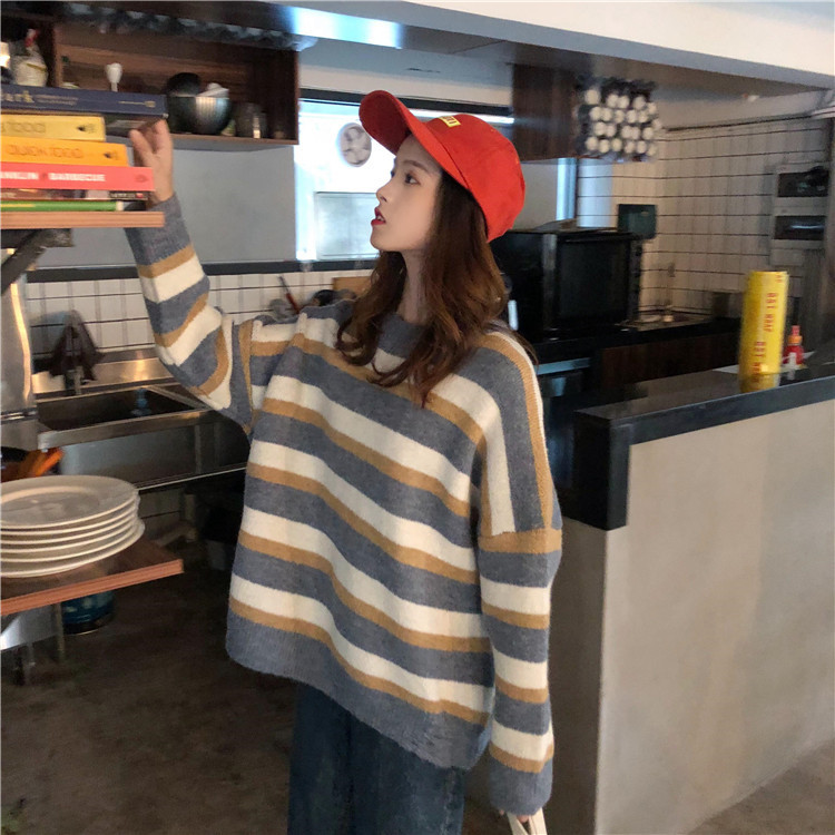 秋季女裝韓版慵懶風條紋撞色BF風寬松破洞網紅套頭針織衫毛衣外套
