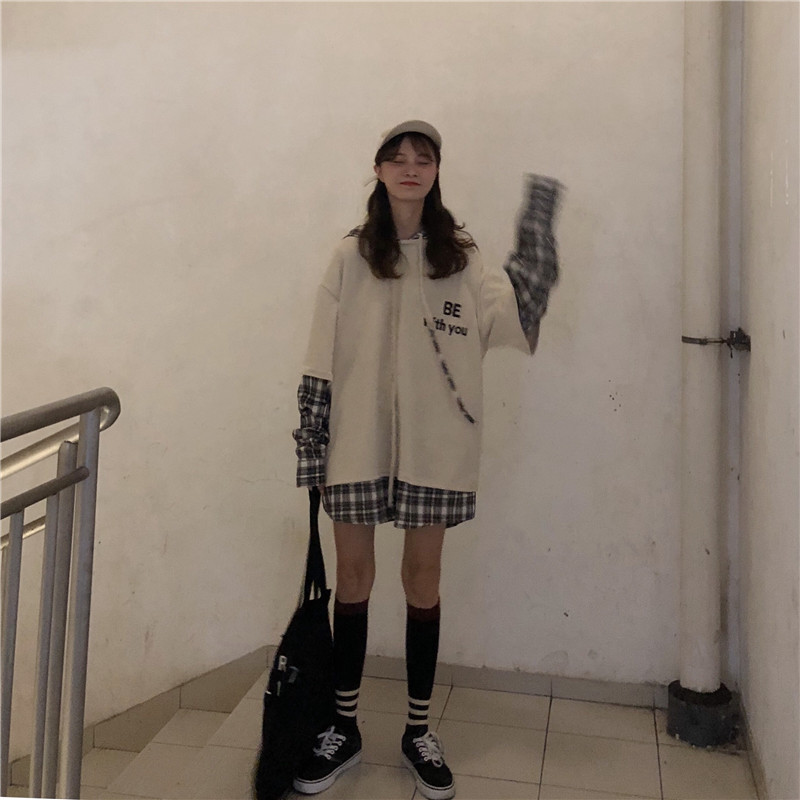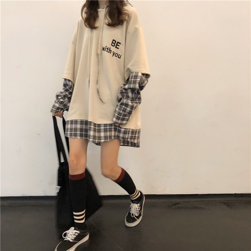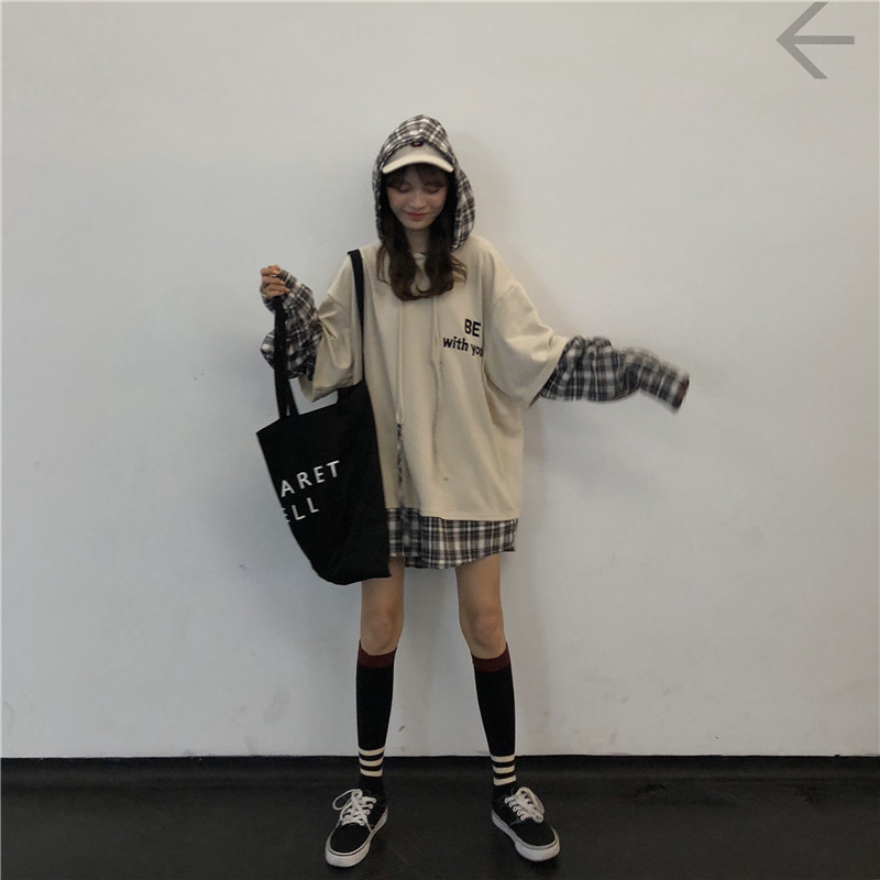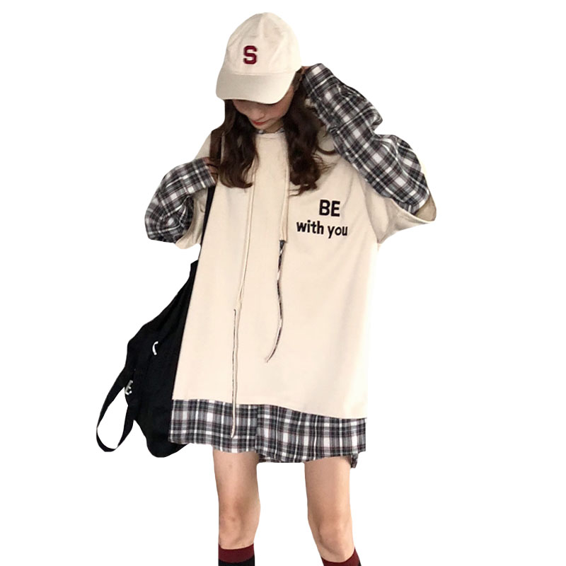 秋季女裝2018新款韓版中長款慵懶風拼接字母寬松連帽超火衛衣外套