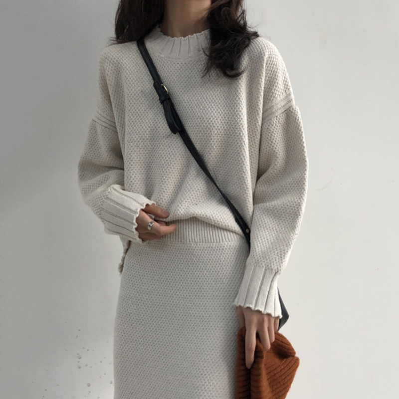 / 氣質女神兩件套秋冬裝新款圓領套頭毛衣高腰顯瘦針織包臀半身裙子