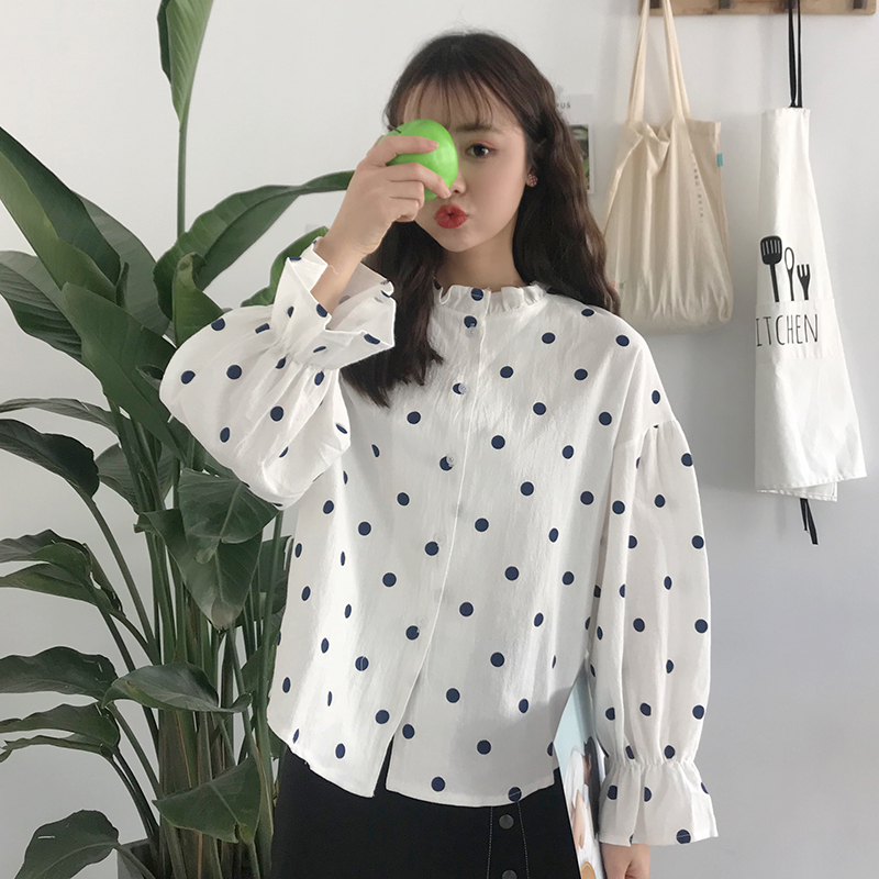 襯衣上衣秋裝女2018新款韓版寬松波點燈籠長袖百搭學生休閑襯衫潮