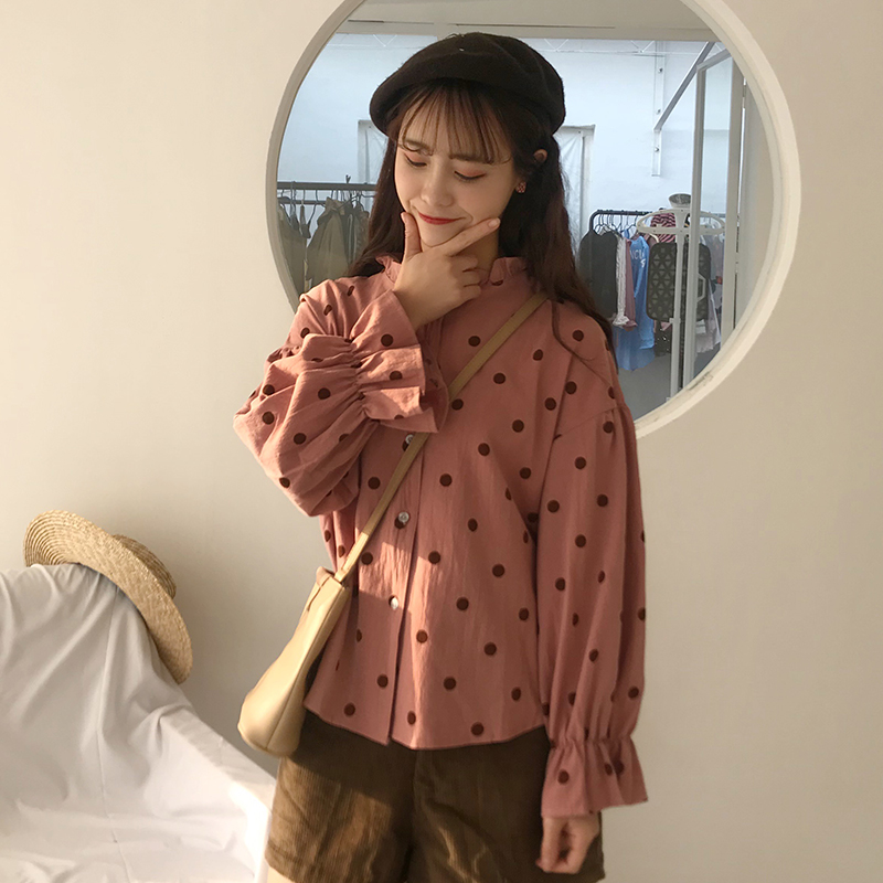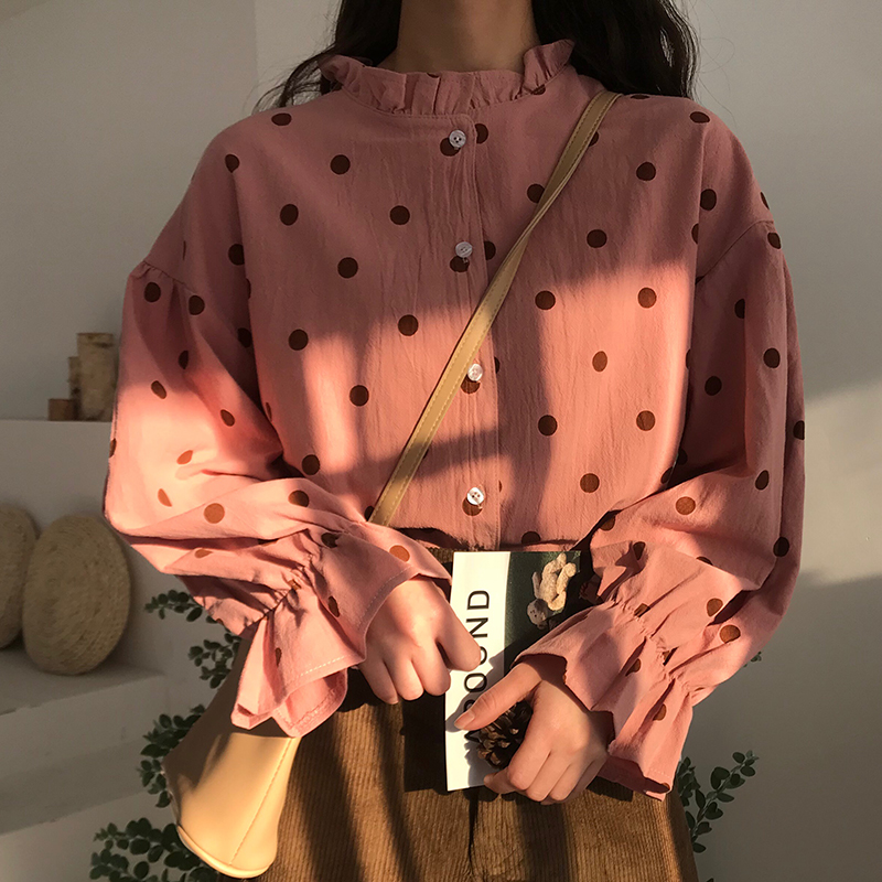 / 襯衣上衣秋裝女2018新款韓版寬松波點燈籠長袖百搭學生休閑襯衫潮