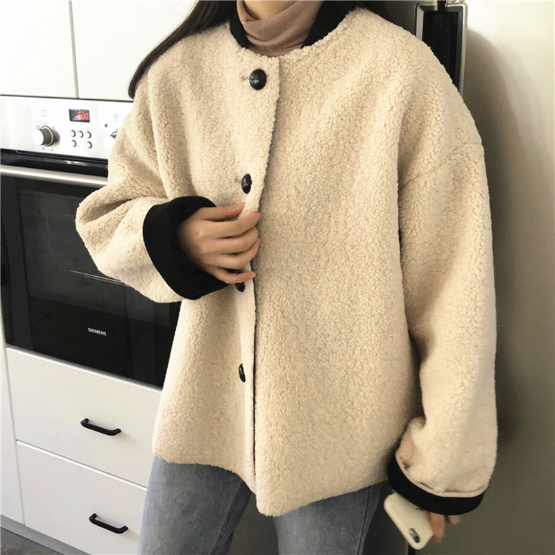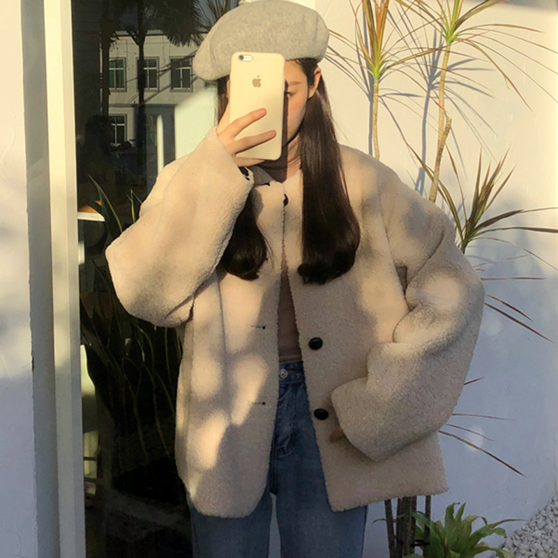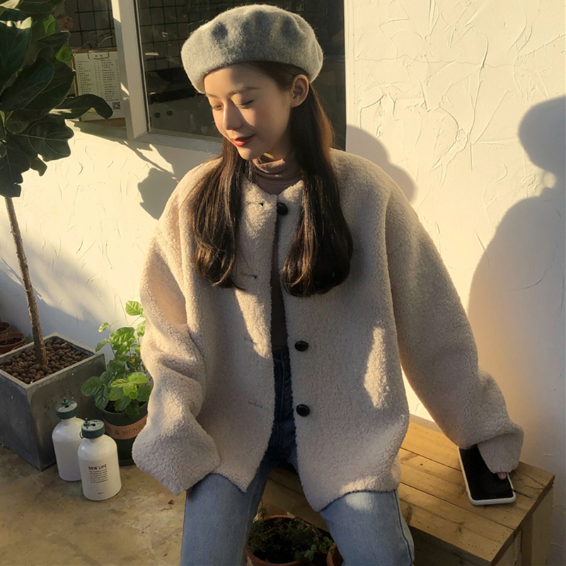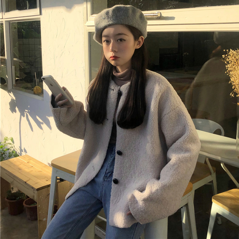 寬松長袖毛絨外套秋冬女裝2018新款港風圓領休閑開衫學生保暖上衣