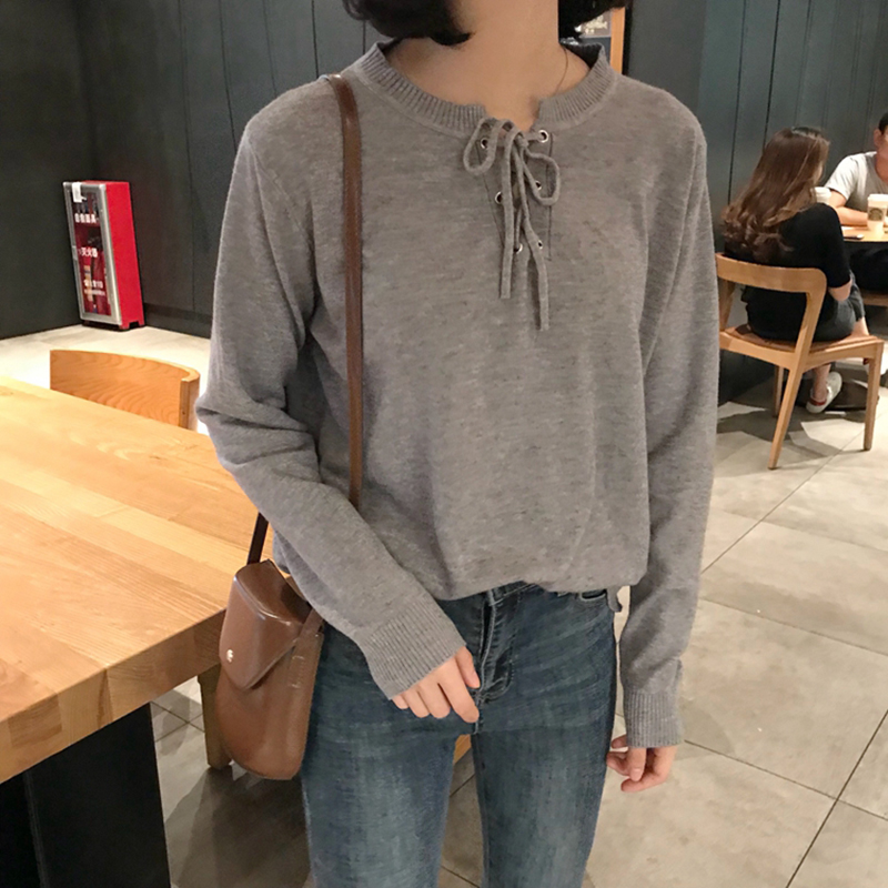 修身圓領系帶打底衫秋裝女2018新款學生體恤衣服韓版長袖T恤上衣