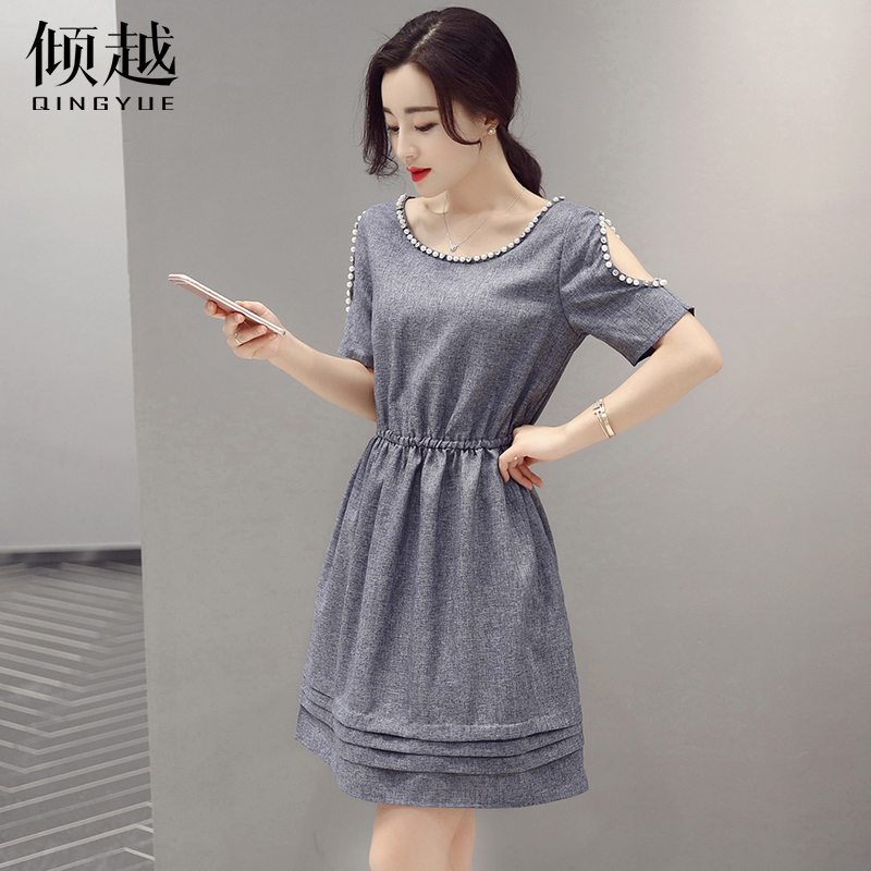 傾越2017夏季女裝收腰圓領短袖露肩連衣裙修身顯瘦簡約甜美裙子潮
