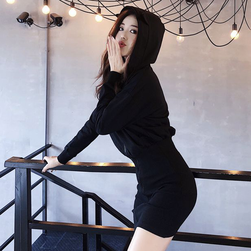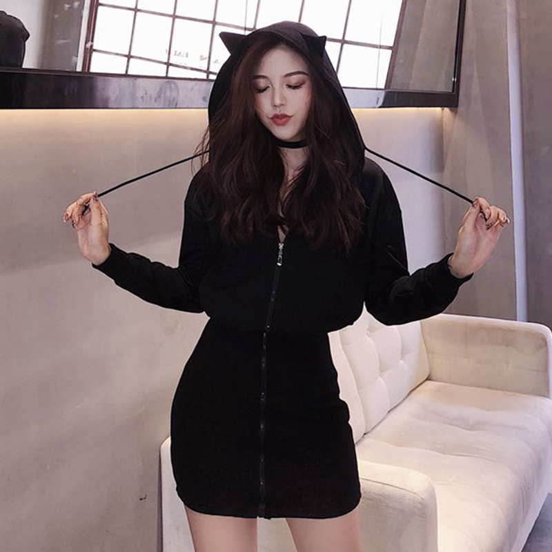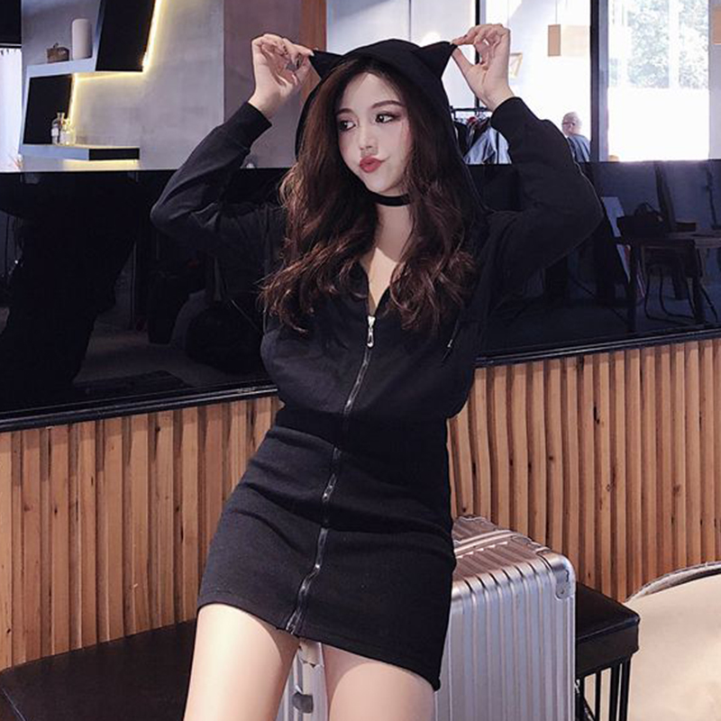 / 氣質修身包臀A字黑裙子秋裝女2018新款港味可愛貓耳朵連帽連衣裙