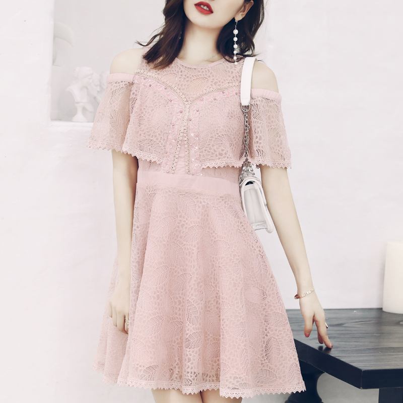 S秀2018夏季新款淑女氣質高腰顯瘦蕾絲連衣裙鏤空鉤花拼接公主裙