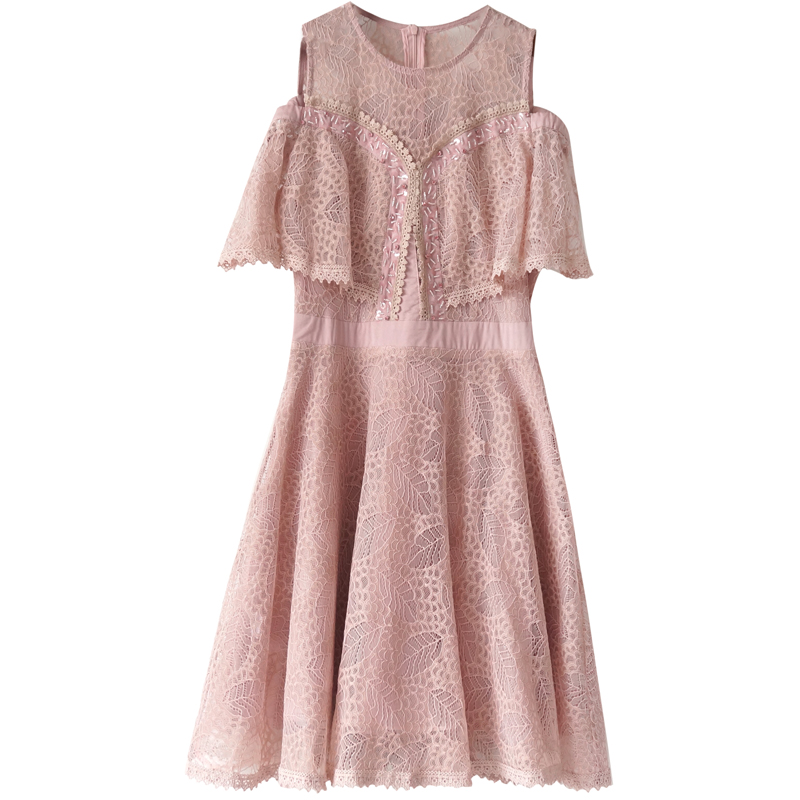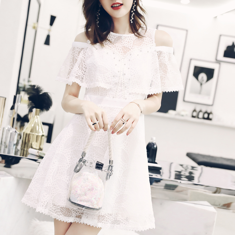 / S秀2018夏季新款淑女氣質高腰顯瘦蕾絲連衣裙鏤空鉤花拼接公主裙
