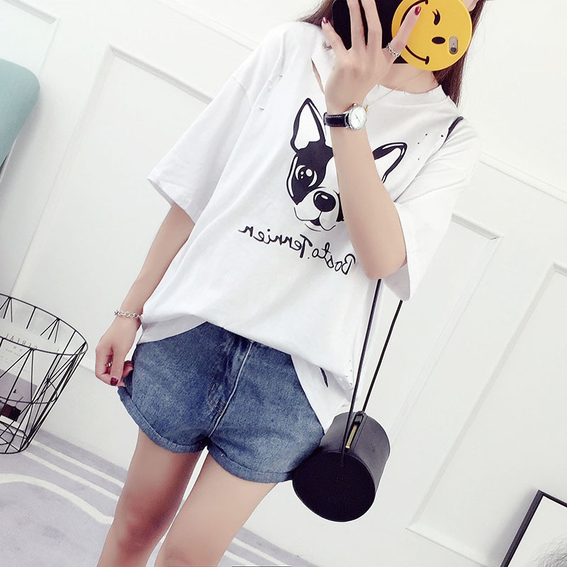 / 新款夏裝韓版潮學生百搭寬松破洞t恤女短袖卡通半袖休閑顯瘦