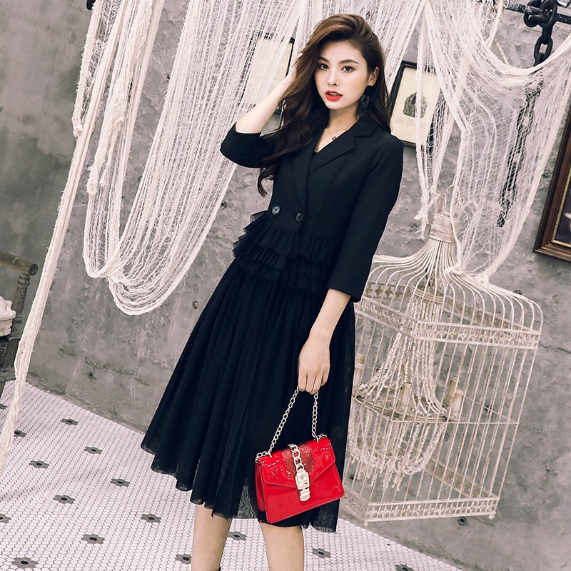 名媛氣質2018秋裝新款時尚休閑個性西裝外套拼接網紗顯瘦連衣裙女