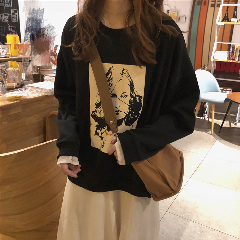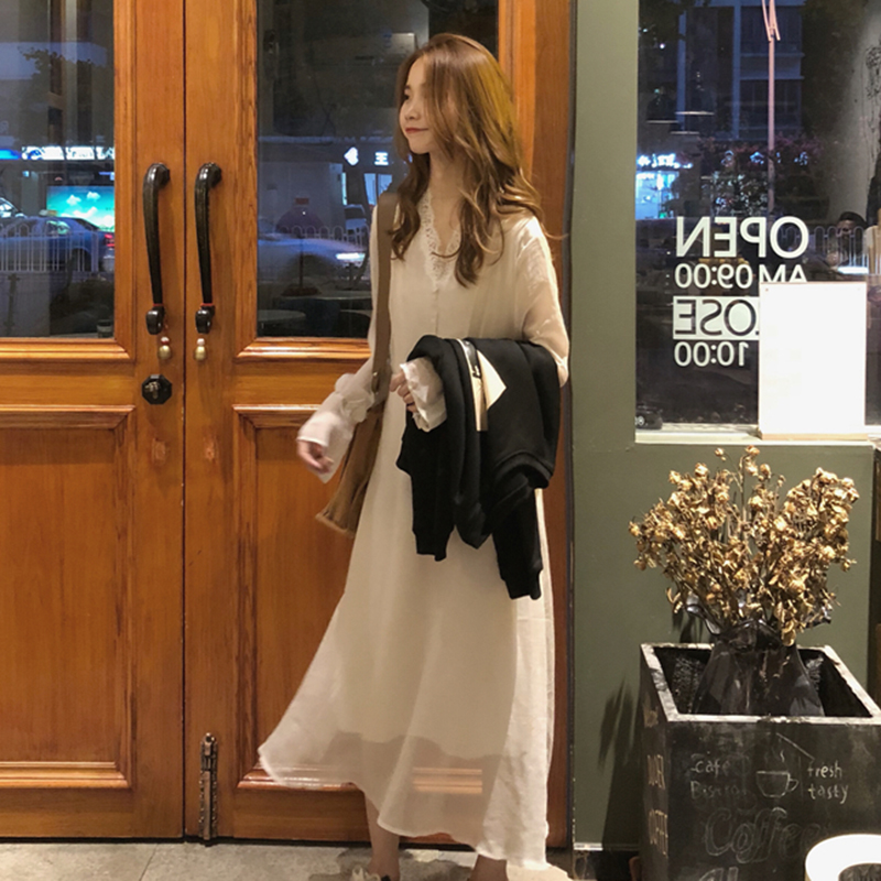 / 秋裝女2018新款簡約圖案長袖衛衣溫柔V領打底蕾絲邊連衣裙兩件套