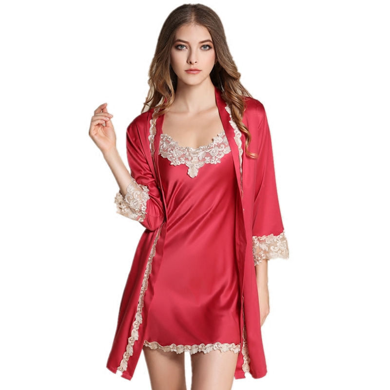 女士睡衣套裝夏春秋季吊帶睡裙蕾絲綢長袖性感睡衣女家居服兩件套