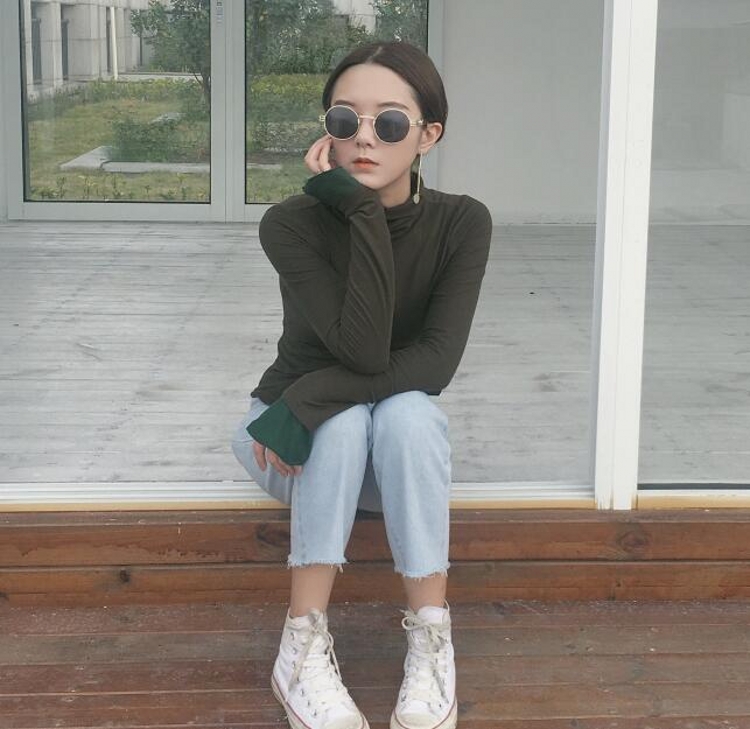 / 韓國chic秋冬款顯瘦彈力高領撞色喇叭袖套頭修身打底衫T恤女