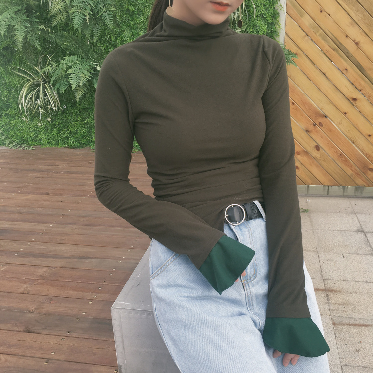 韓國chic秋冬款顯瘦彈力高領撞色喇叭袖套頭修身打底衫T恤女