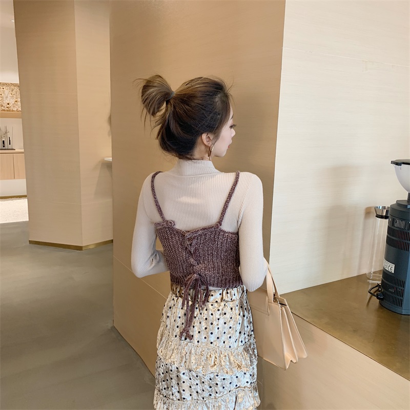 / 韓版氣質高腰荷葉邊A字裙+后背綁帶針織吊帶女+針織打底衫三件套