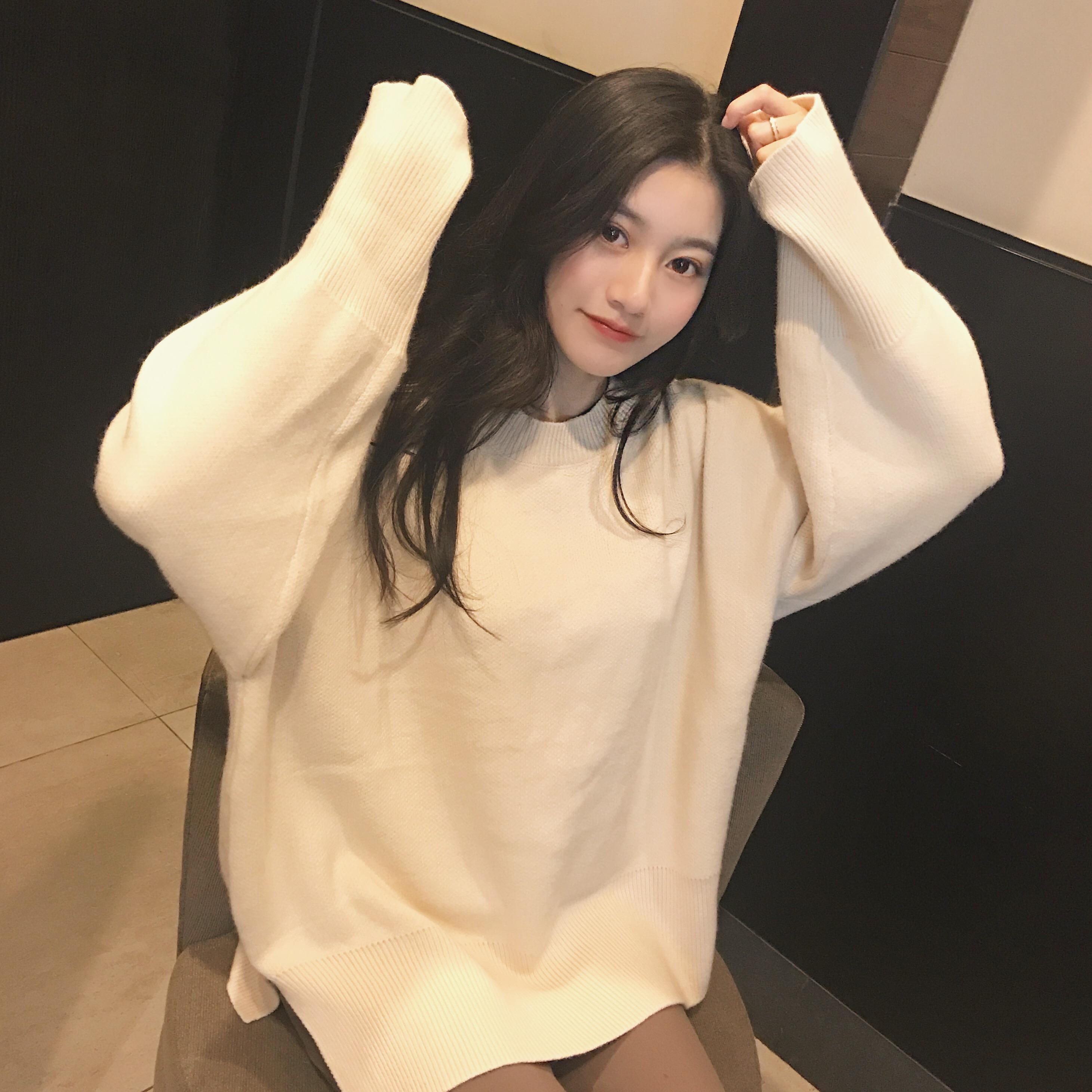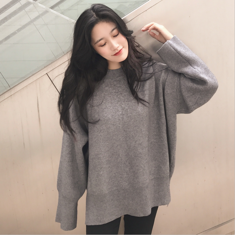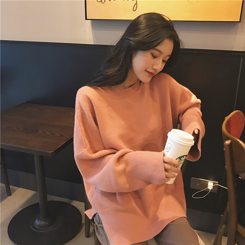 秋冬新款韓國厚實上衣百搭寬松慵懶套頭chic下擺開叉毛衣針織衫女