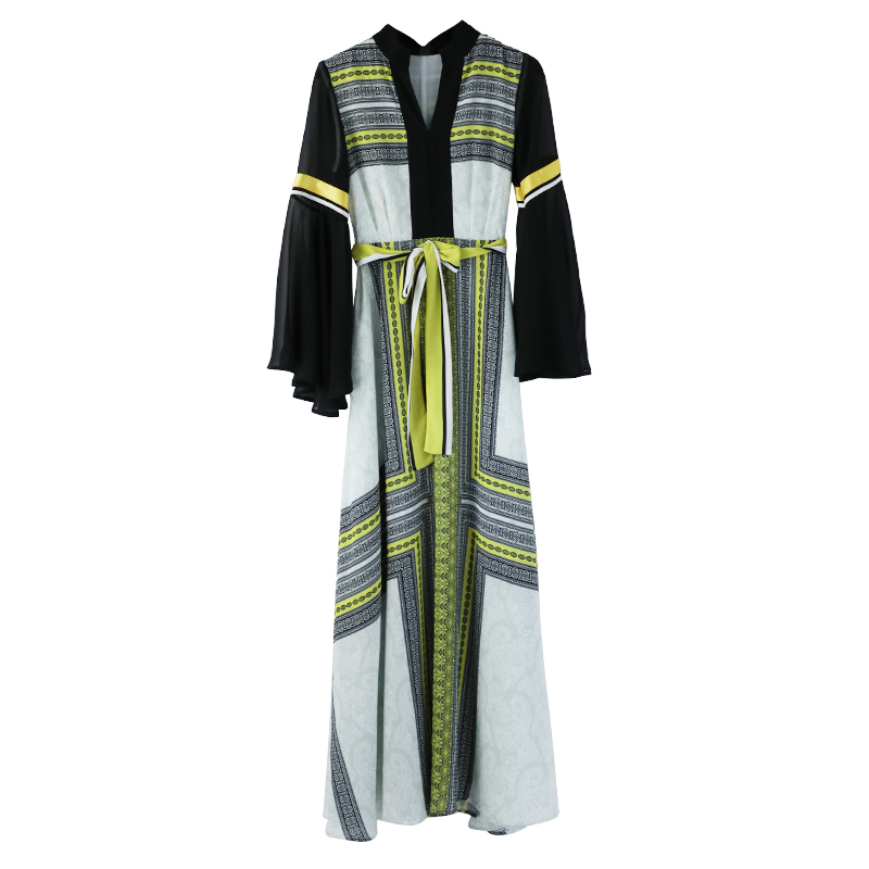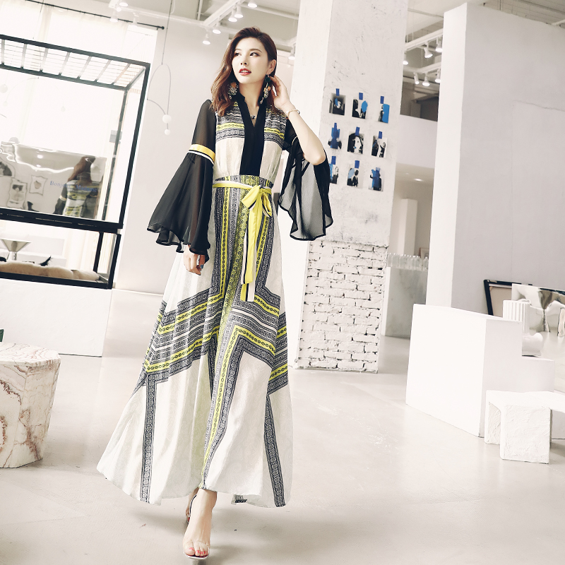 名媛氣質溫柔裙超仙收腰顯瘦喇叭袖復古印花長袖中長款高腰連衣裙