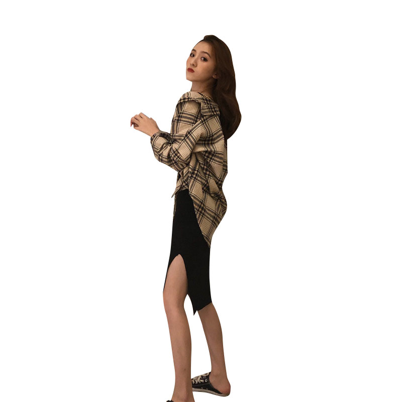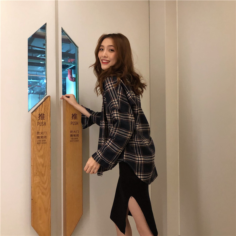 韓版時尚中長款格子襯衫薄寬松港風春秋長袖襯衣外套女裝2018新款