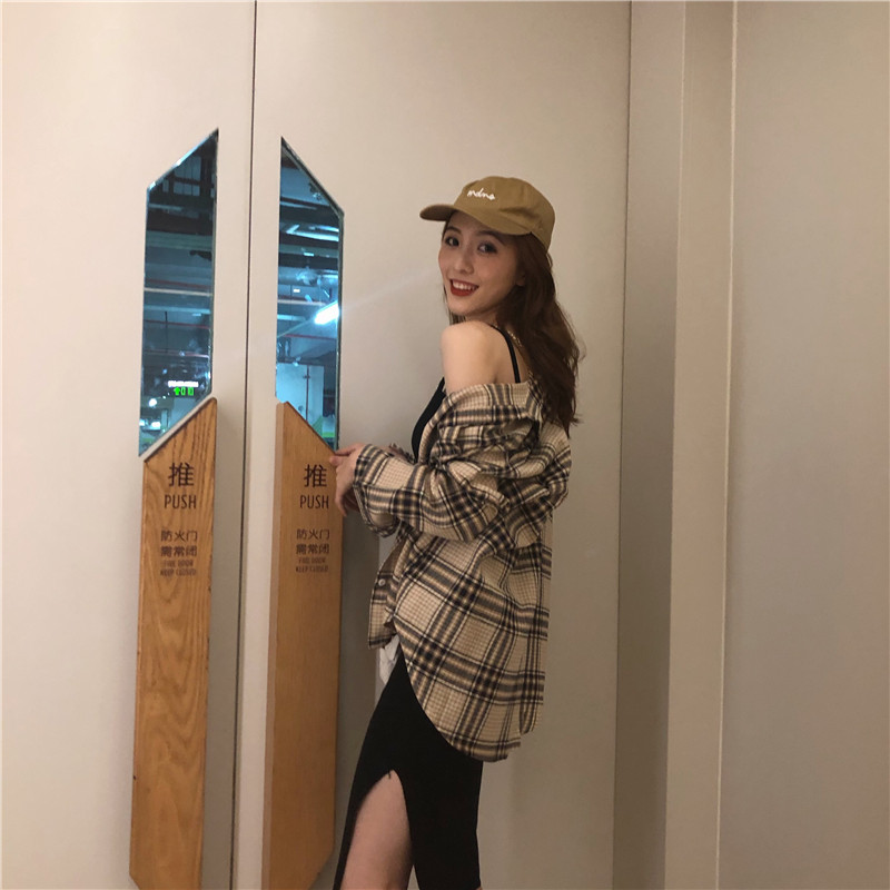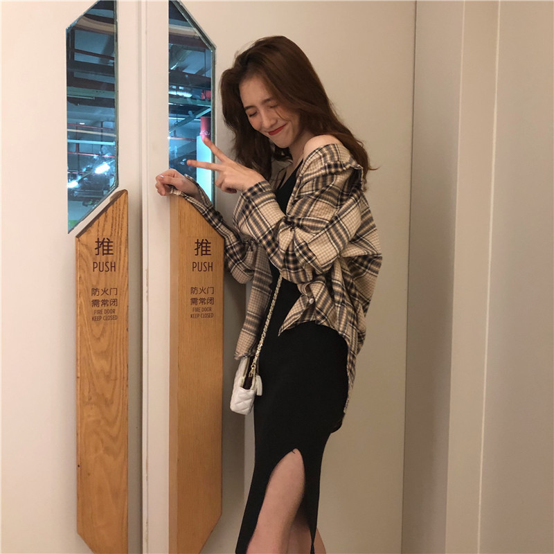 寬松格子長袖防曬襯衫女+掛脖包殿針織吊帶連衣裙時髦套裝分開拍