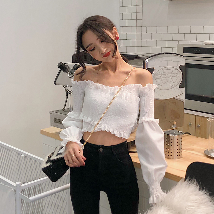 / 春裝新款女裝韓版露臍裝上衣落肩花邊交叉一字領露肩長袖短款襯衫