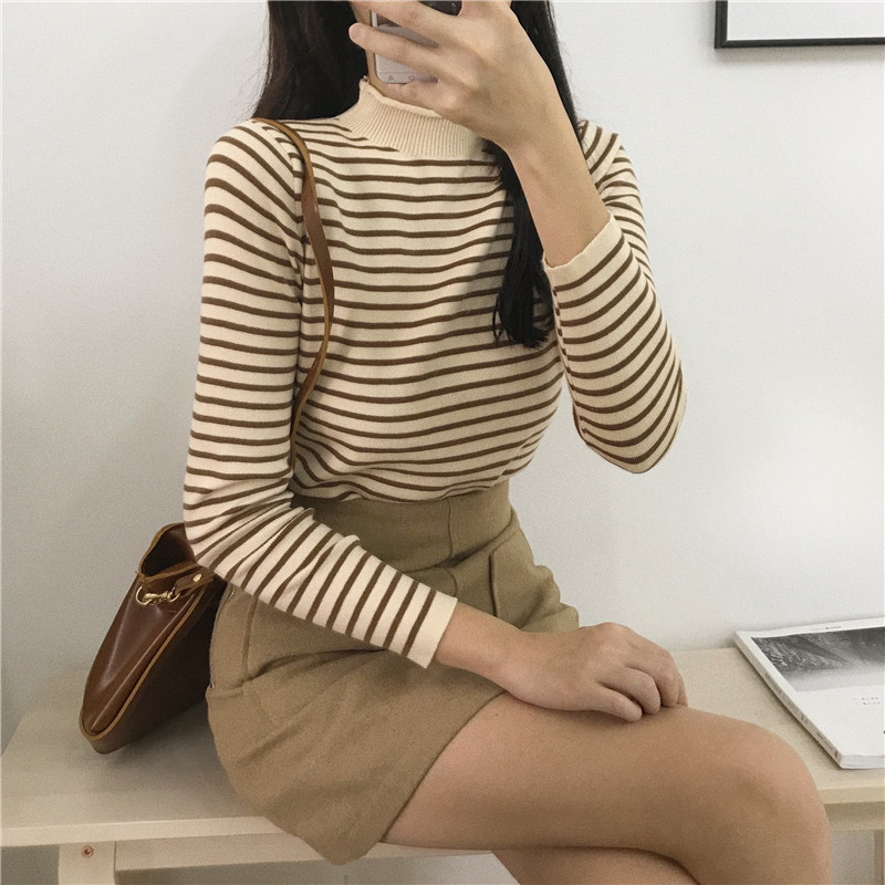 / 秋冬韓版修身顯瘦半高領卷邊條紋網紅套頭打底衫針織衫毛衣上衣女