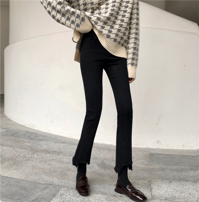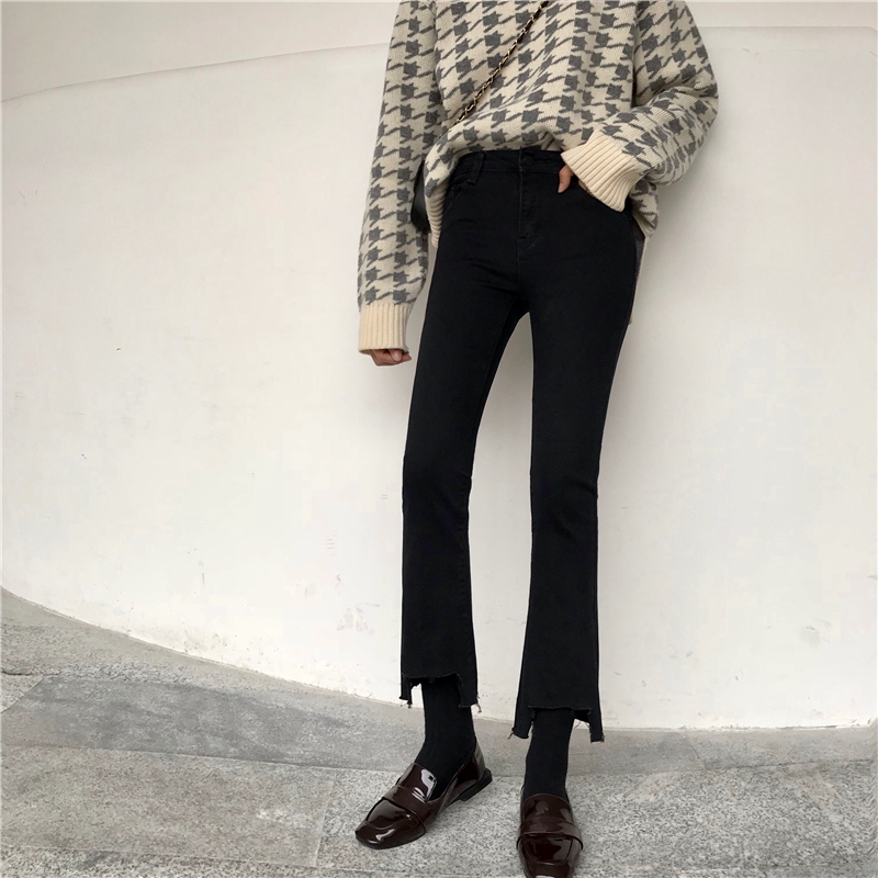 女褲子2018新款復古百搭黑色微喇叭褲高腰牛仔褲修身毛邊九分褲潮