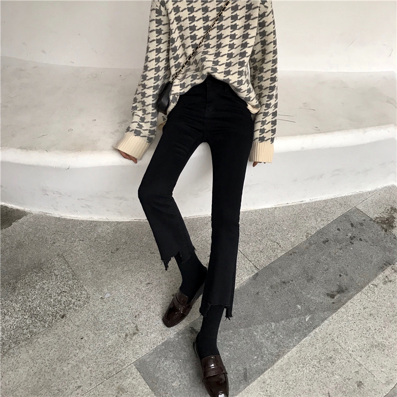網紅同款牛仔褲女秋冬2018新款韓版顯瘦喇叭褲九分褲高腰黑色褲子