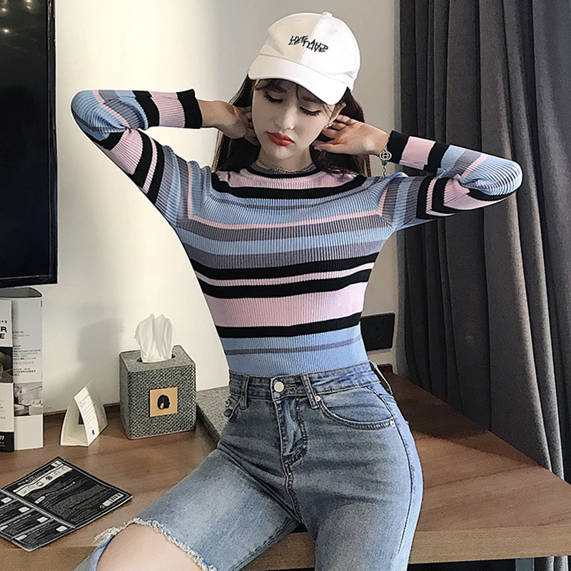 / 韓版chic撞色條紋長袖針織衫女秋冬裝2018新款氣質修身打底薄毛衣