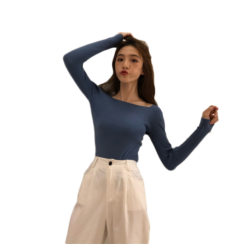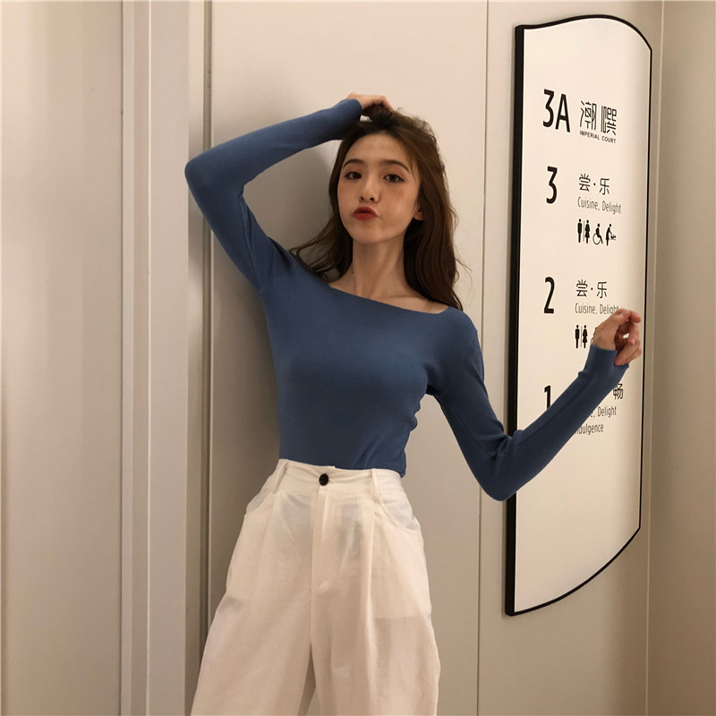 復古chic慵懶風毛衣女2018新款方領長袖T恤女修身顯瘦打底針織衫