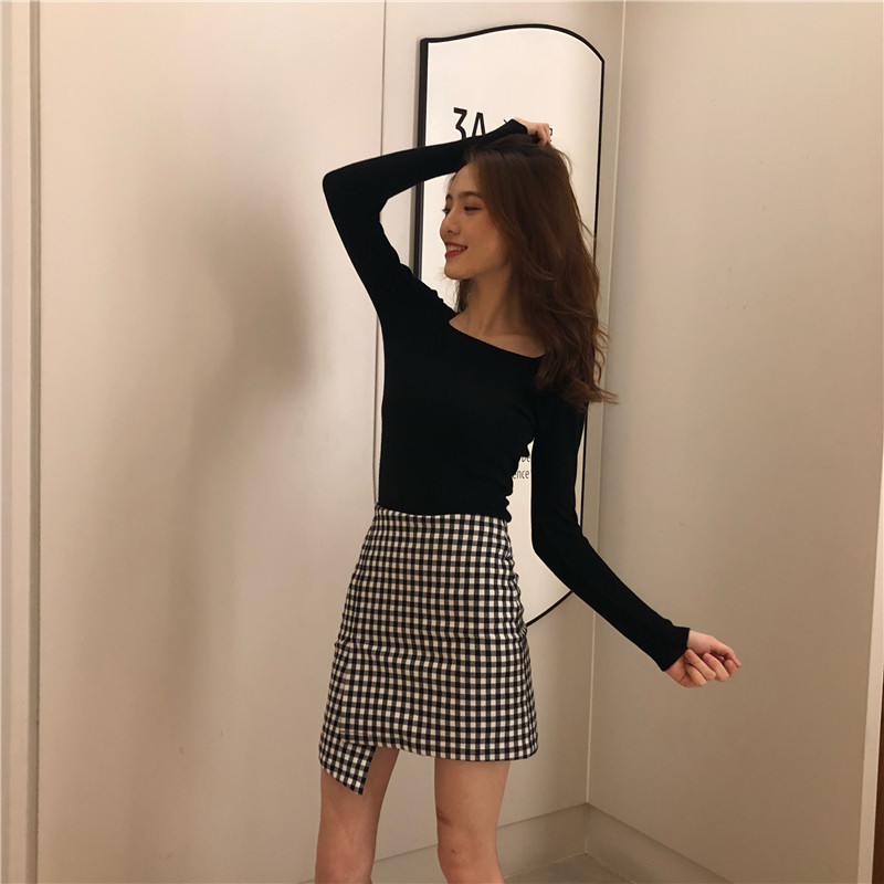 / 復古chic慵懶風毛衣女2018新款方領長袖T恤女修身顯瘦打底針織衫