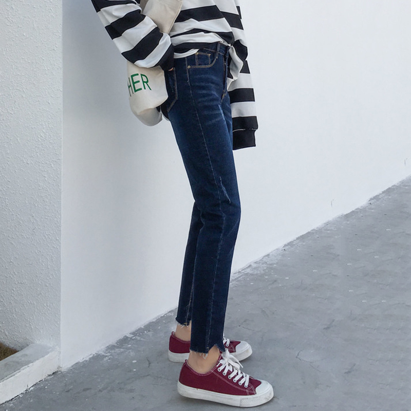 復古顯瘦高腰百搭彈力牛仔褲女秋冬裝新款學生不規則休閑九分褲子