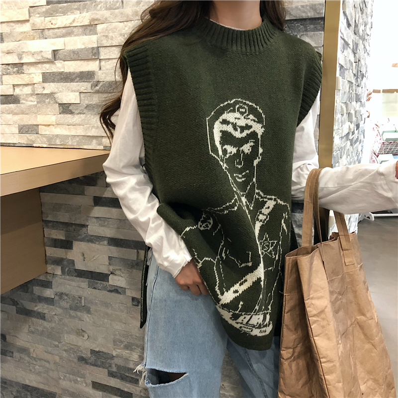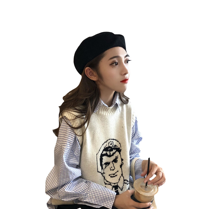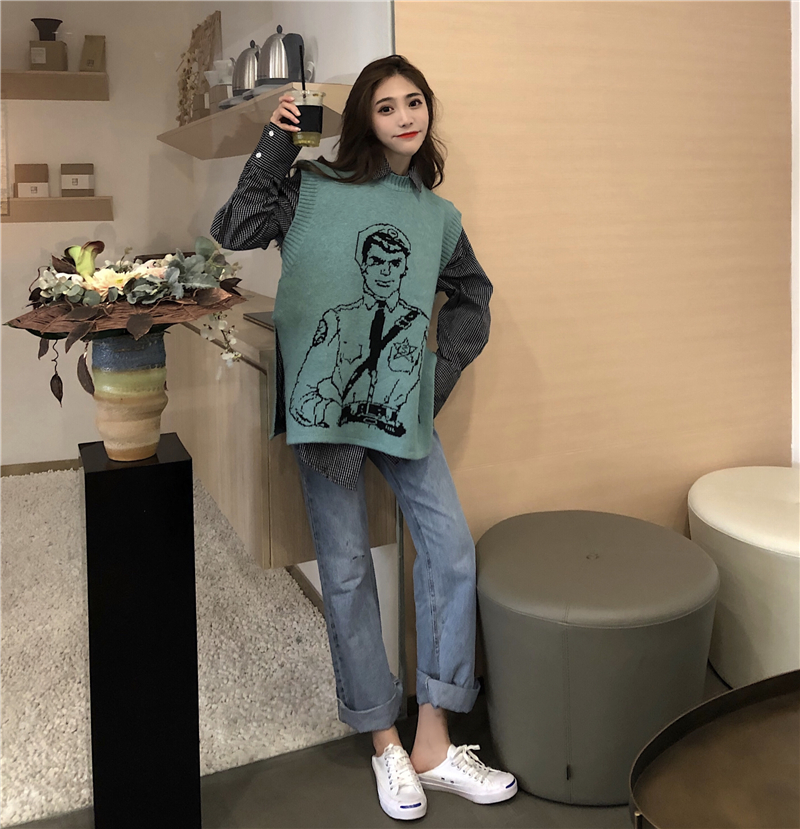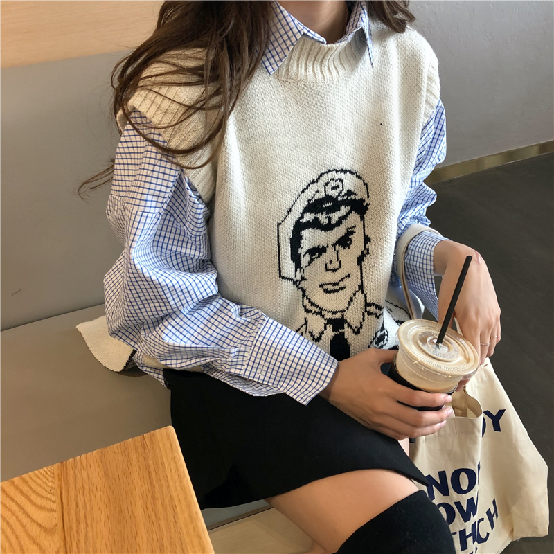 / 韓版時尚休閑套裝秋季人頭針織馬甲背心+中長款格子襯衫兩件套女