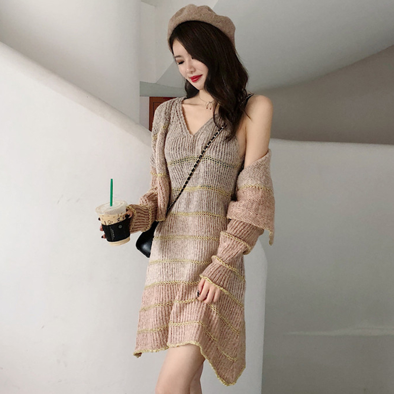 / 赫本套裝女秋冬新款慵懶長袖針織開衫短外套修身顯瘦吊帶連衣裙子