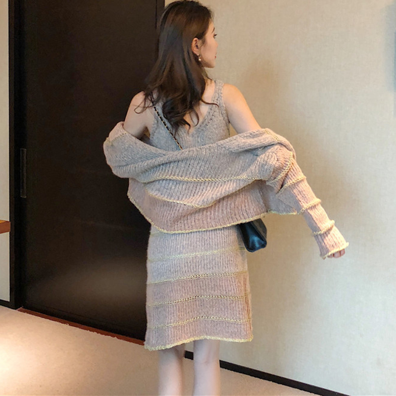 赫本套裝女秋冬新款慵懶長袖針織開衫短外套修身顯瘦吊帶連衣裙子