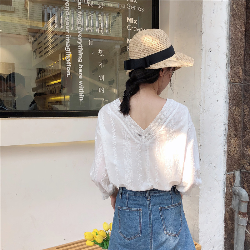 / 夏季女裝新款韓版寬松氣質燈籠袖白色小衫鏤空花邊大V領襯衫上衣