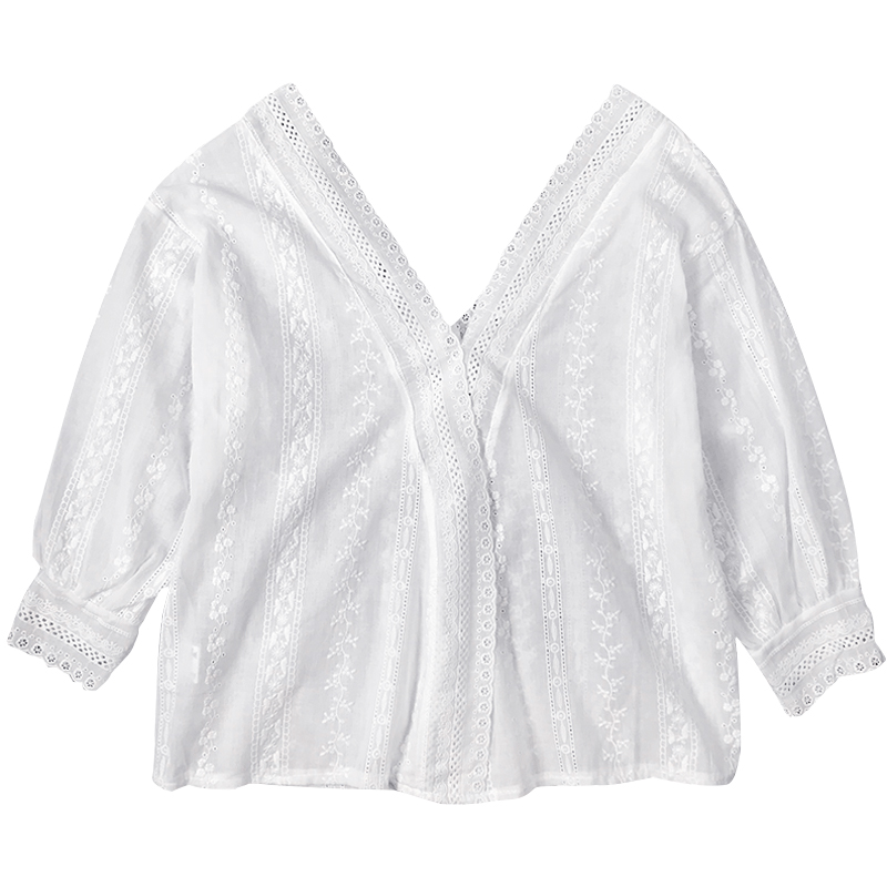夏季女裝新款韓版寬松氣質燈籠袖白色小衫鏤空花邊大V領襯衫上衣