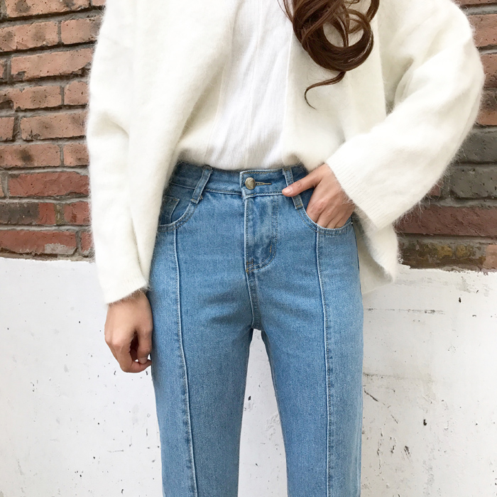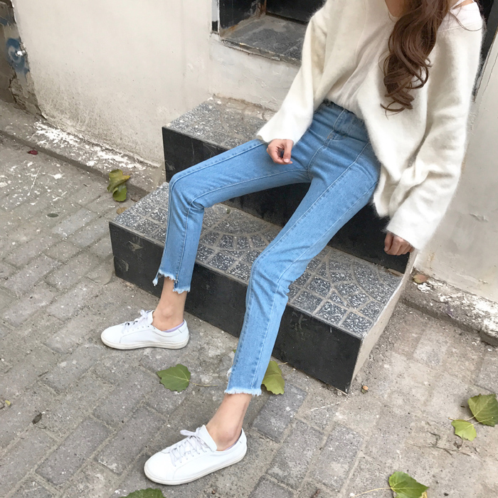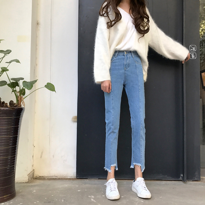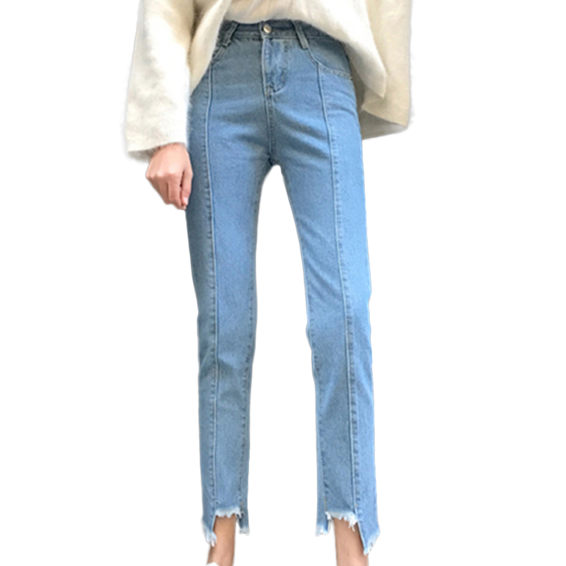 / 早春新款女裝高腰寬松顯瘦不規則毛邊缺口學生百搭直筒九分牛仔褲