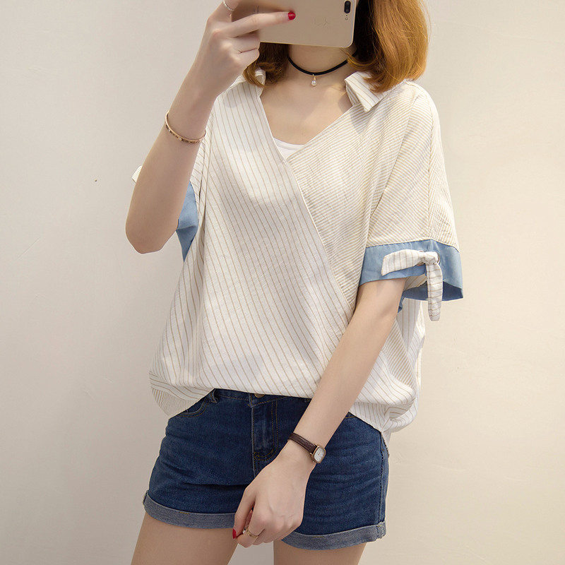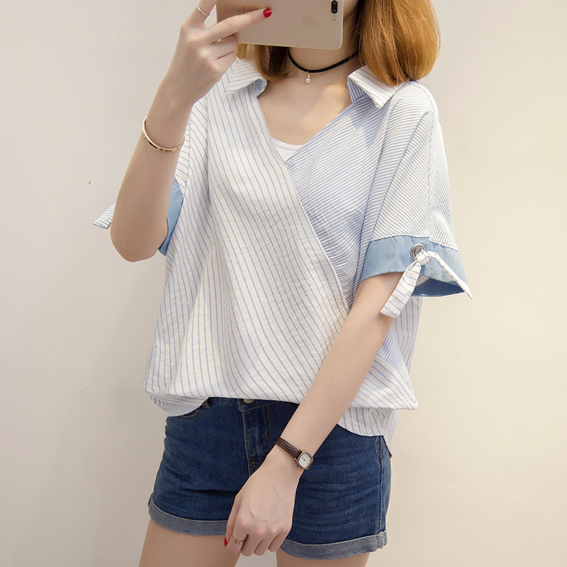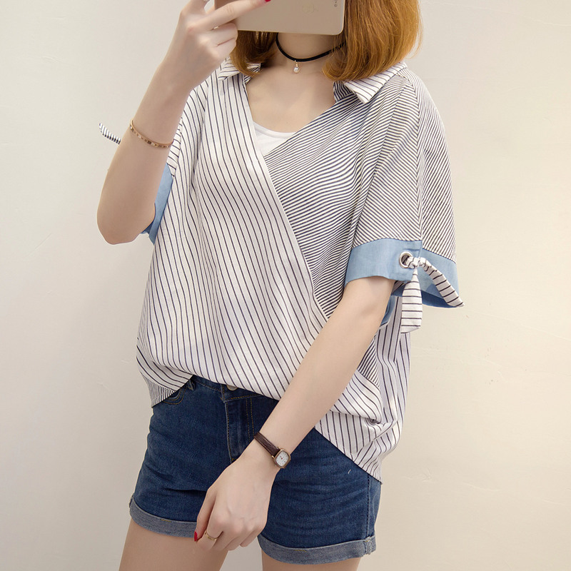 / 夏裝新款女拼接不規則條紋白襯衫女半袖bf風韓范上衣V領襯衣